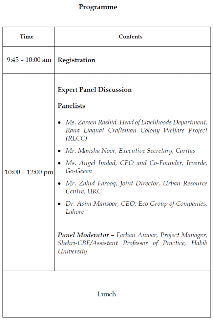 • Ms. Zareen Rashid, Head of Livelihoods Department, Rana Liaquat Craftsmen Colony Welfare Project (RLCC)