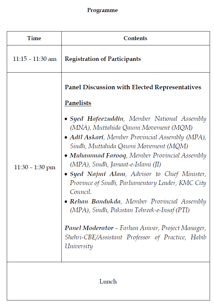Shehri-Citizens for a Better Environment (Shehri-CBE) hosted a successful Workshopfeaturing a Panel Discussion with elected representatives at Habib University, Karachi. The event was held in collaboration with the Social Development & Policy Program, School of Arts Humanities & Social Sciences (AHSS) , as part of the ongoing project “Youth Empowerment for Engaged Citizenship”.